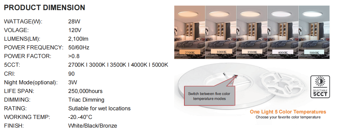 A-SDL12IN-28W-5CCT-WH / A-SDL12IN-28W-5CCT-WH-NL 12 Inch LED Ceiling Light Overview: The A-SDL12IN-28W-5CCT series is a 12 inch ultra-thin LED ceiling light designed for modern residential and commerc...