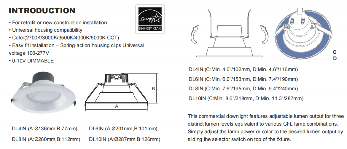 A-DLxIN-xxW-345K LED Downlight – 4" / 6" / 8" / 10" 5CCT & Wattage Adjustable Overview: The A-DLxIN-xxW-345K LED Downlight series is a high-performance commercial recessed lighting solution ...