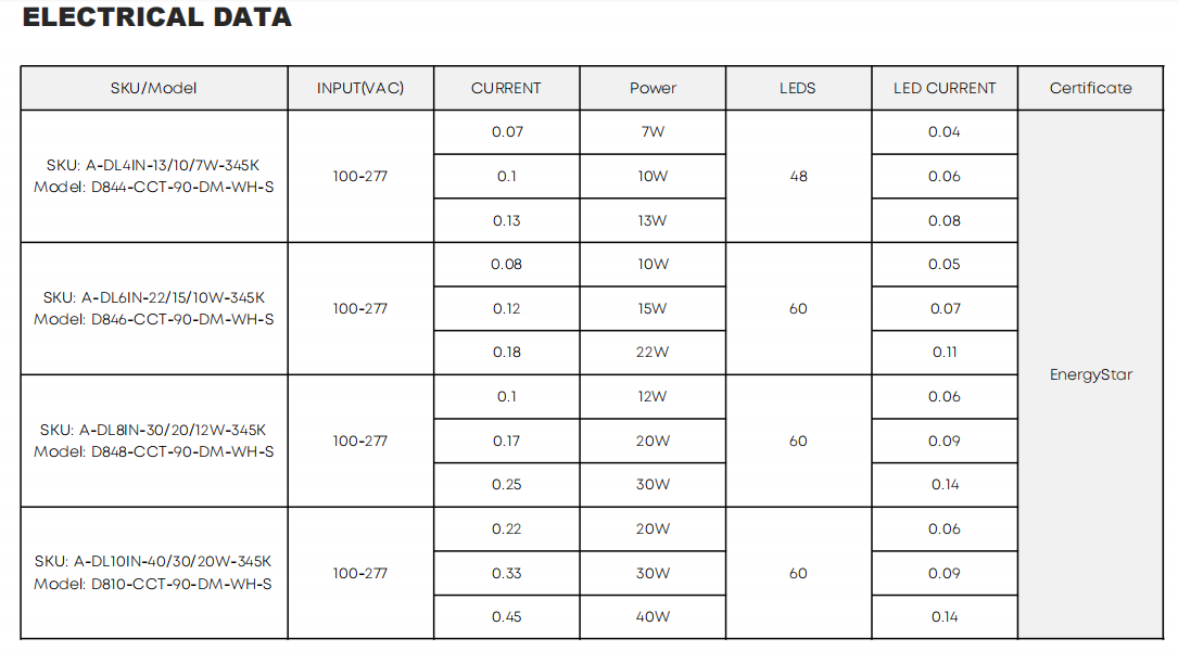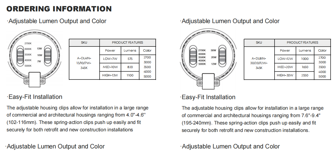 Contact Us for AccessoriesThe A-DLxIN-xxW-345K LED Downlight series is a high-performance commercial recessed lighting solution designed for retrofit and new construction applications. Featuring both 5CCT selectable color temperature and field-adjustable wattage, this versatile LED downlight reduces inventory complexity while maximizing on-site flexibility.