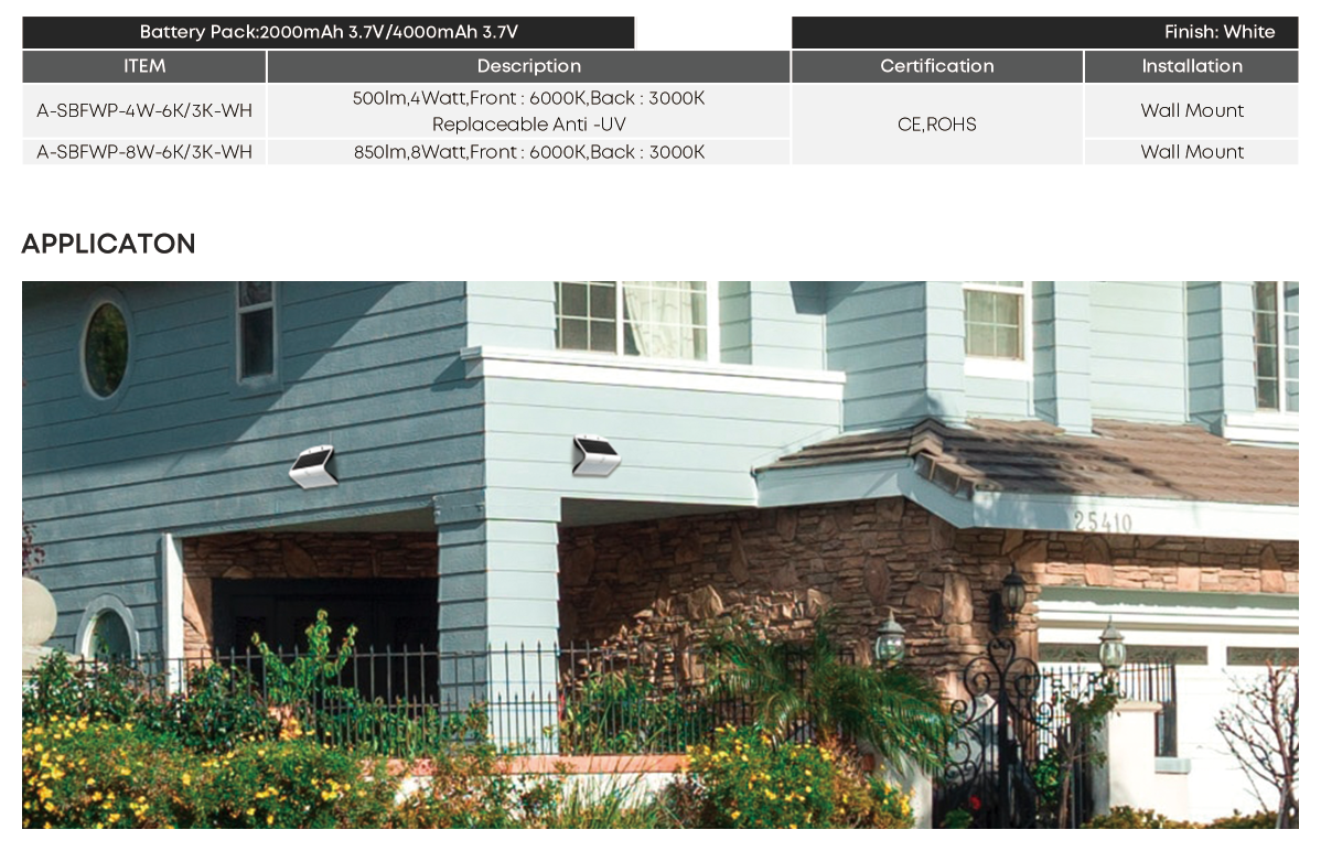 This 4W Solar LED Wall Light delivers 500 lumens of bright, energy-efficient outdoor illumination with zero electricity cost. Powered by a high-efficiency 2.4W monocrystalline solar panel and a replaceable 18650 2000mAh lithium-ion battery, it provides reliable dusk-to-dawn lighting with intelligent PIR motion detection.