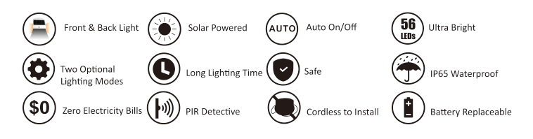 Equipped with 56 high-performance SMD2835 LEDs (54 front + 2 rear), this solar security light offers enhanced front and back illumination for improved visibility and safety. The built-in PIR sensor features a 120° detection angle with a sensing distance of 2–6 meters, making it ideal for driveways, gardens, pathways, garages, and entryways.