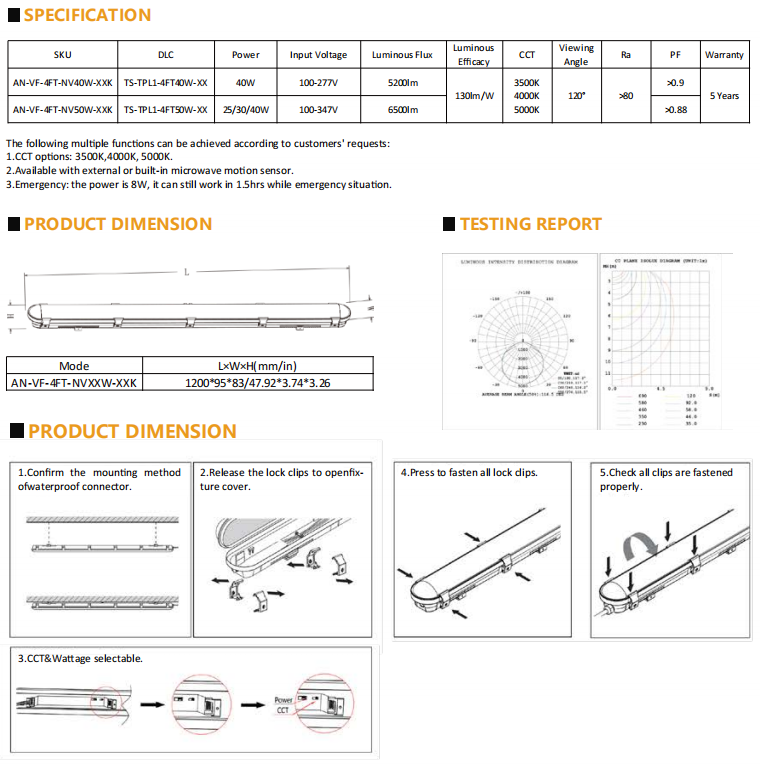 With a 120° beam angle, CRI >80, PF >0.9, and modular installation design, this 4FT LED vapor tight light reduces installation time and maintenance cost. Suitable for supermarkets, warehouses, underground parking garages, production workshops, and utility areas.