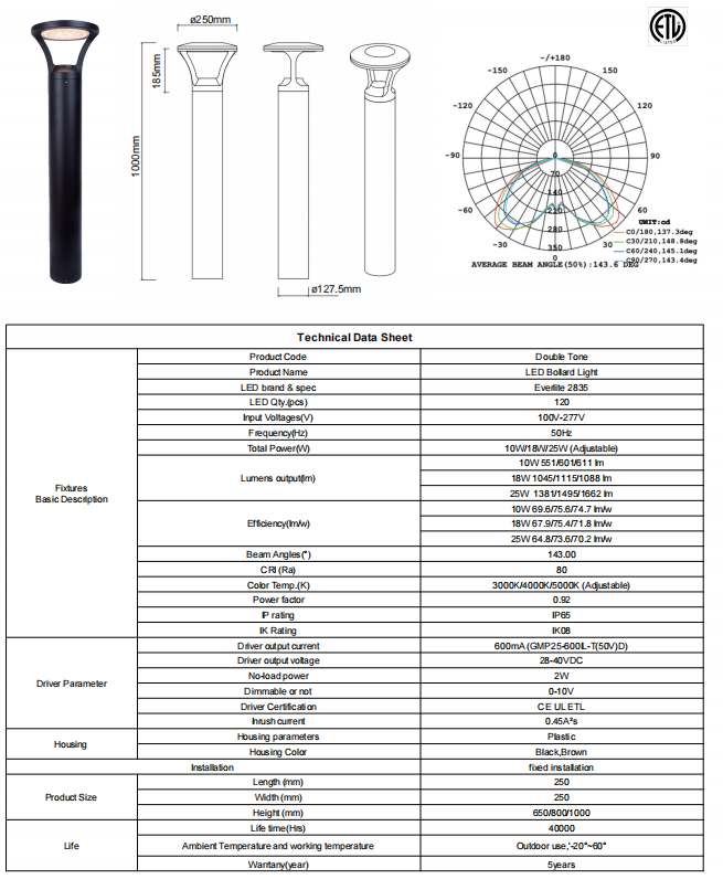 The A-B10/18/25W LED Bollard Light is a versatile and energy-efficient outdoor lighting solution designed for pathways, parks, commercial landscapes, and architectural perimeter lighting. Featuring adjustable wattage (10W/18W/25W) and selectable color temperatures (3000K/4000K/5000K), this LED bollard provides flexible illumination tailored to diverse outdoor applications.