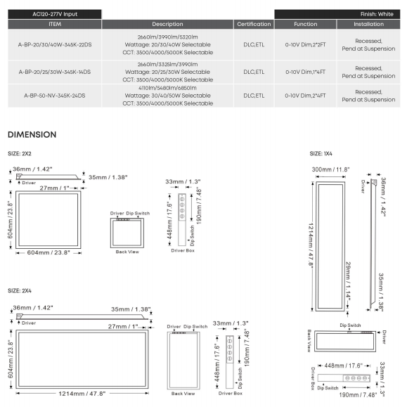Contact Us for Accessories*Warranty: 5 years, 50,000hrs life design for driver and LED*Input Voltage: 120-277Vac, 0-10V dimmable